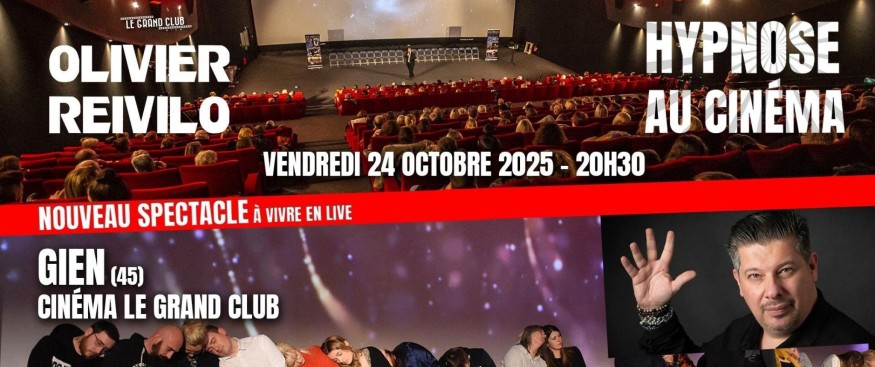 Préparez-vous à vivre une expérience hors du commun ! Le vendredi 24 octobre 2025 à 20h30, le Cinéma Le Grand Club de Gien (45) accueillera Olivier Reivilo, maître de l’hypnose de spectacle, pour une soirée fascinante et inoubliable : “Hypnose au Cinéma”.